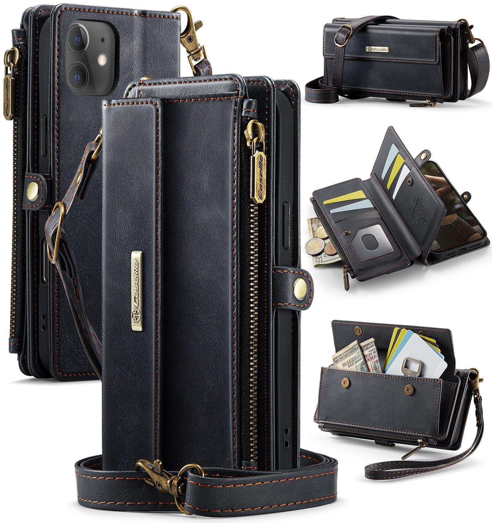 New RFID Blocking Zipper Wallet Supports Wireless Charging with Long and Short Lanyard Leather Phone Case for iPhone