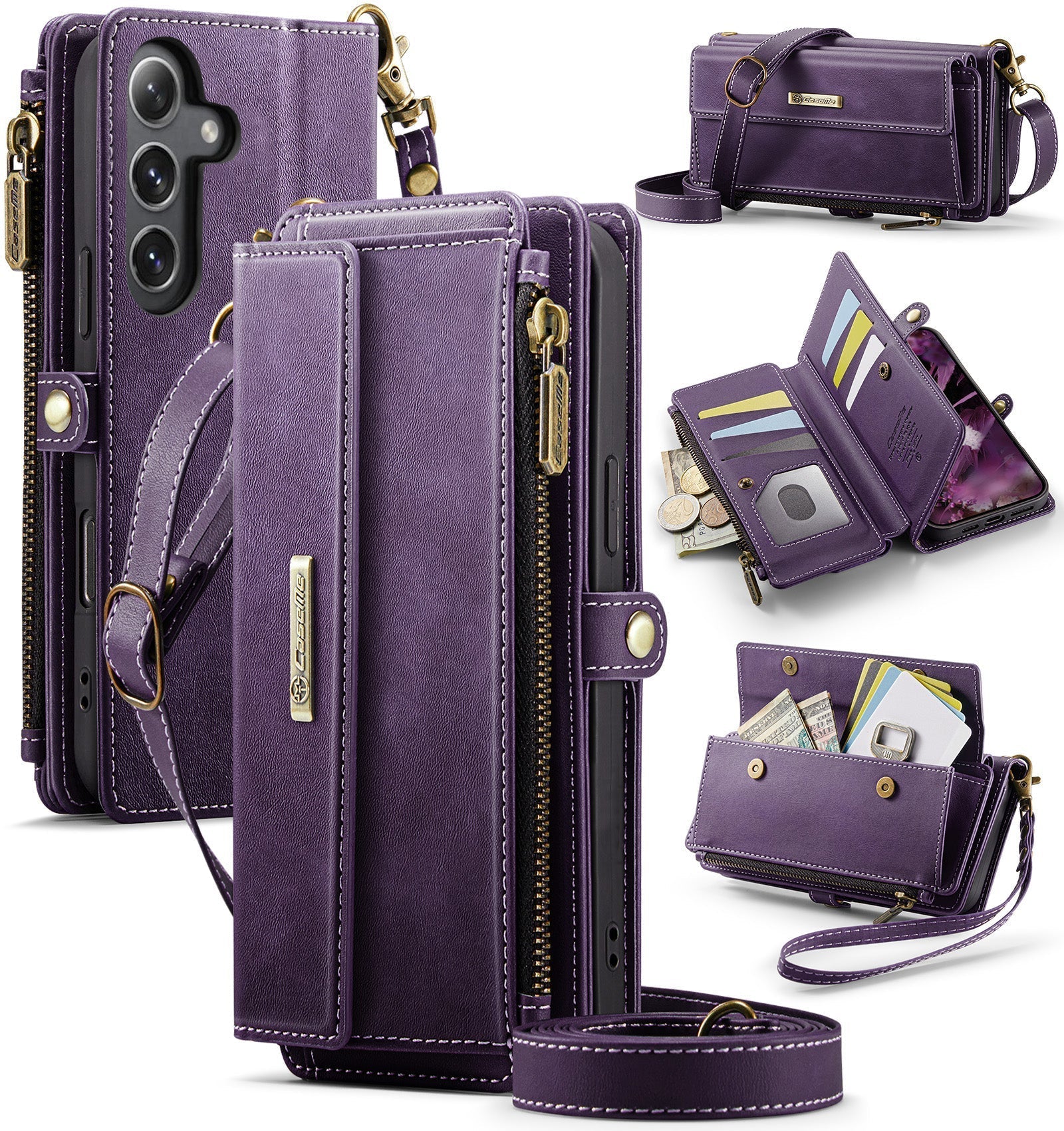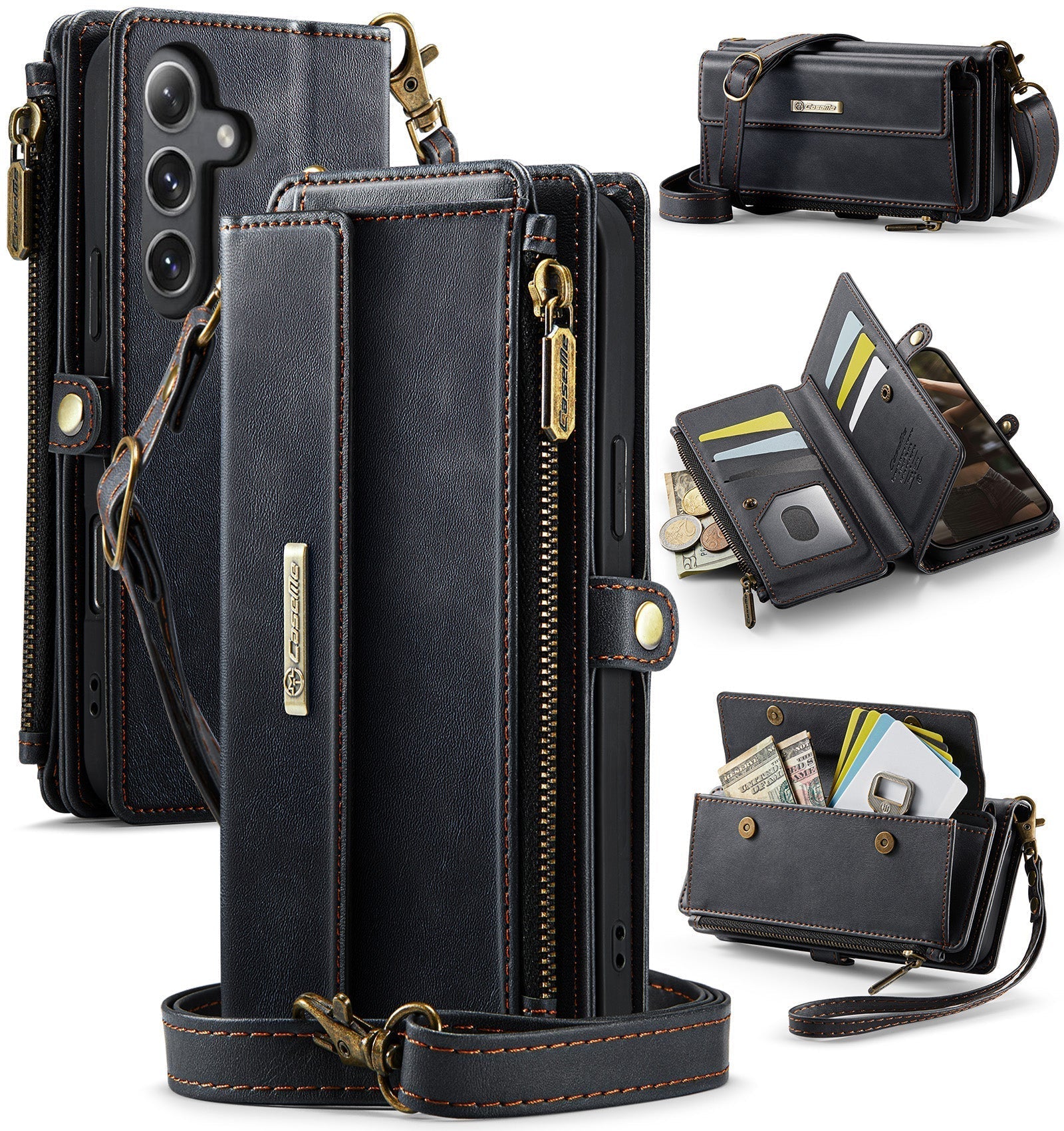 New RFID Blocking Zipper Wallet Supports Wireless Charging with Long and Short Lanyard Leather Phone Case for Samsung